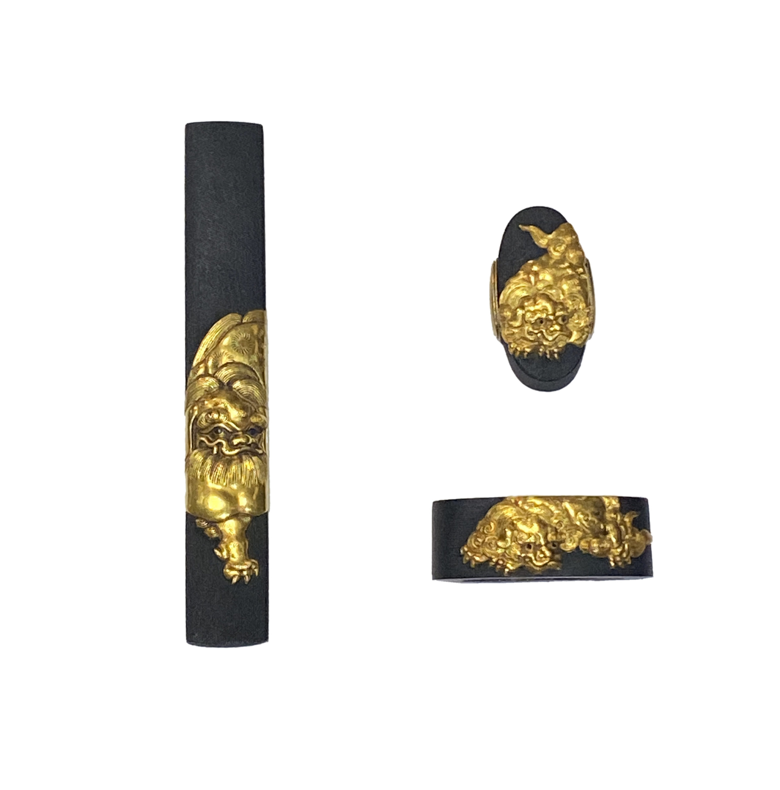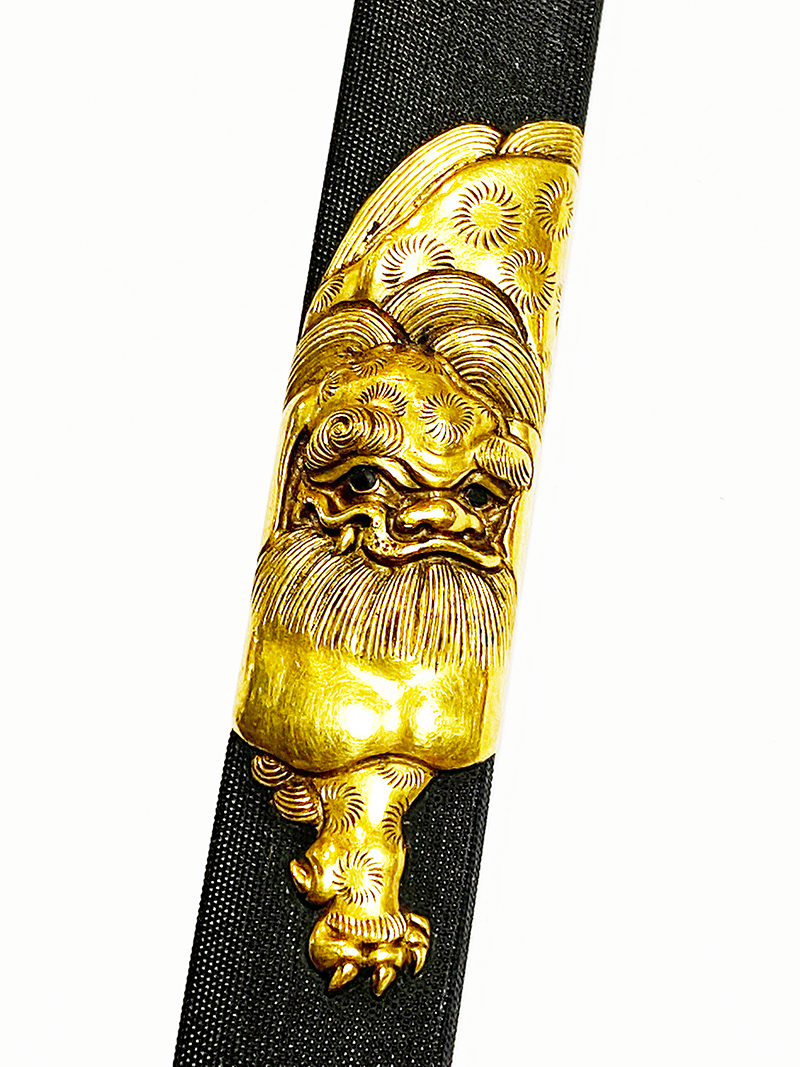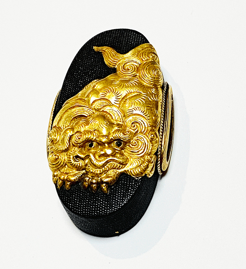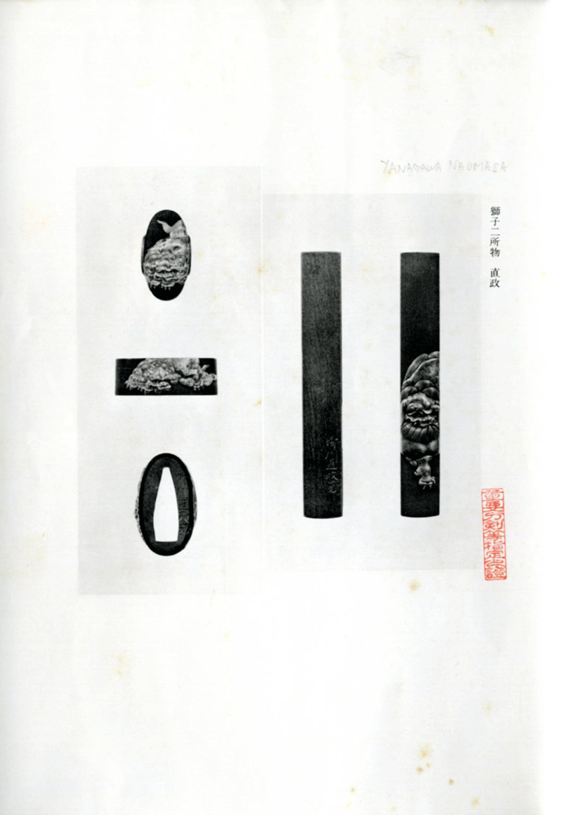 本作は赤銅魚子地に、肉厚な高彫工法と金色絵で剽悍な獅子を力強く彫り上げており、正面から睨みを効かせるどこか可愛らしい風貌はまさに師、横谷宗珉の作品を彷彿とさせる。横谷獅子の称呼が世に名高くなったとともに、柳川獅子とも呼ばれるに至ったと言われる直政得意の意匠であるが、彼の作品は意外と伝世数が少なく、これだけの名人にして重要刀装具指定作品は執筆時で僅か5点と希少であり、かつ二所の指定品は本作のみという同作の代表作とも言える大変貴重な優品である。