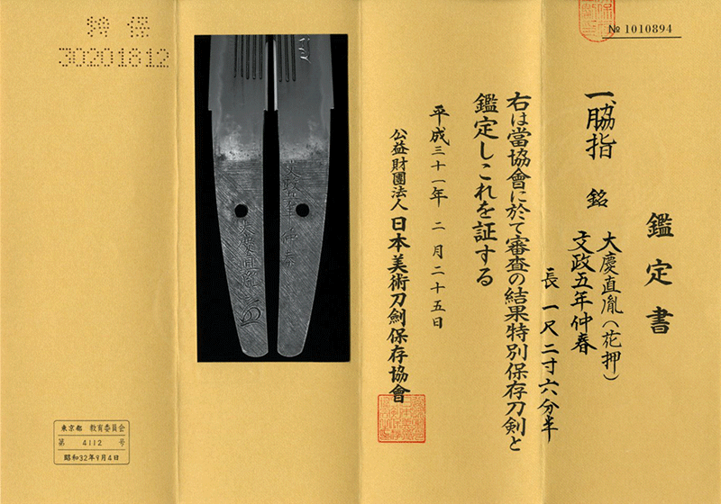 鑑定書内容:財)日本美術刀剣保存協会 特別保存刀剣[N.B.T.H.K]Tokubetsu Hozon Token