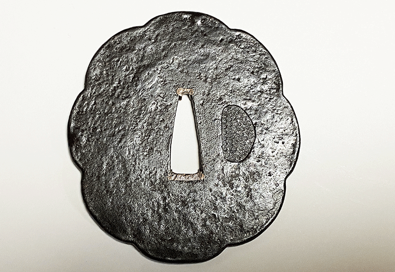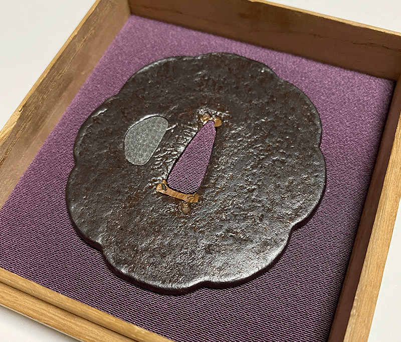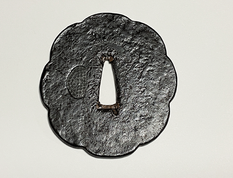 鐔工「信家」は織田信長に仕えて、尾張国清州城下で鐔制作に励んだと云われている。信家は京都伏見の金家とともに鉄鐔の双璧を成し、ともに鐔を工芸品から芸術品にまで高めた名人である。絵風鐔を創始した金家に対し、信家は概ね厚手で量感に溢れ、鍛えが無類によく、各種図柄や神号、剣の極意や武士の思想などを毛彫で表した作品が残されている。拵の種別を問わず据えられた作品の品格を一格も二格も向上させてくれる同作はまさに鐔の王者というに相応しく、古来多くの武将や偉人達に好まれ名作の拵に用いられてきた。名の字体から「放れ銘」「太字銘」の二種類に大別され、太字銘信家は放れ銘信家と親子、あるいは兄弟の関係と考えられている。本作は「太字銘」の信家で八ツ木瓜形の地に無作為に槌目を配し、焼手を加えた表面には鉄骨が隆々と現れている。過去に経眼した同作中でも無類に鍛えの良い作品で、極限まで作意を排した枯淡の境地といえる作風からは鉄の鍛に於いて右に出るもの無しと謳われる信家の絶対的な技量を感じることが出来る。同国の法安鐔にも同意匠の作品を見た記憶があり後世にも大きな影響を与えたと推察される同作中の優品である。