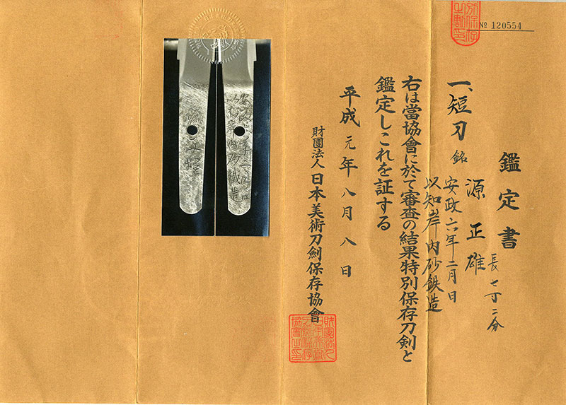 鑑定書内容:財)日本美術刀剣保存協会 特別保存刀剣[N.B.T.H.K]Tokubetsu Hozon Token
