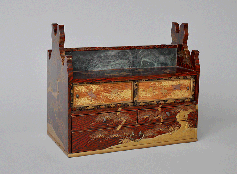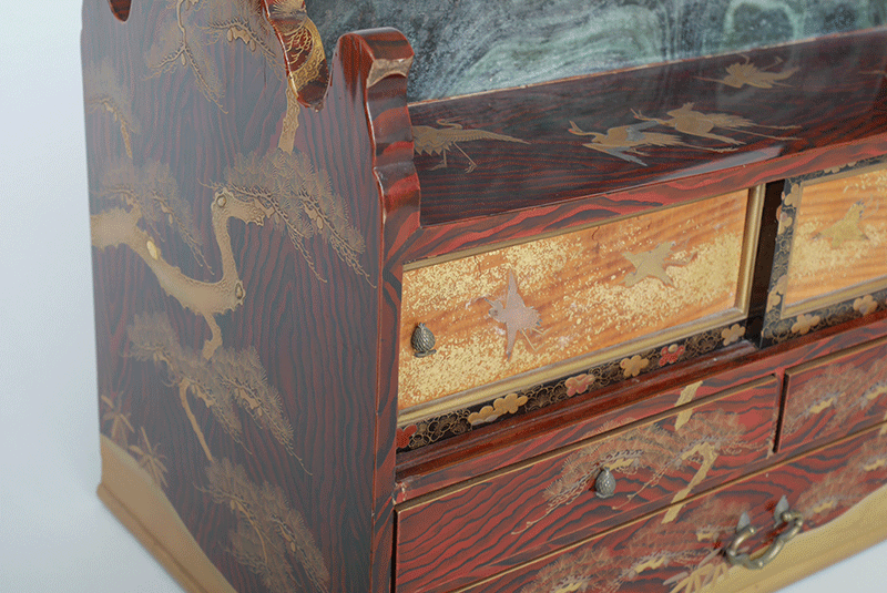 小箪笥と刀掛を合わせた小ぶりな三本掛刀掛。赤い漆で木目を描いた上から側面は老松を、天面には飛び交う鶴を平蒔絵と高蒔絵で表現していて蓬莱山の図である。引戸は明るい木目が漆で描かれ、その上から金が蒔かれ、鶴が金貝と平蒔絵で表現されている。桟は梅花の図案で、四分一製の引手金具は松笠と竹が彫金され、吉祥と不老長寿の祈りが込められた特注品である。特に鏡板に貴重な孔雀石を用いた工夫は他に経眼がなく大変珍しい意匠である。