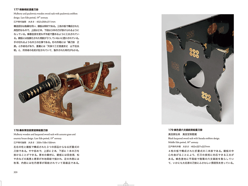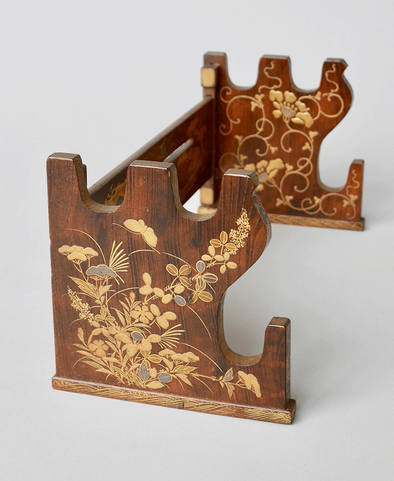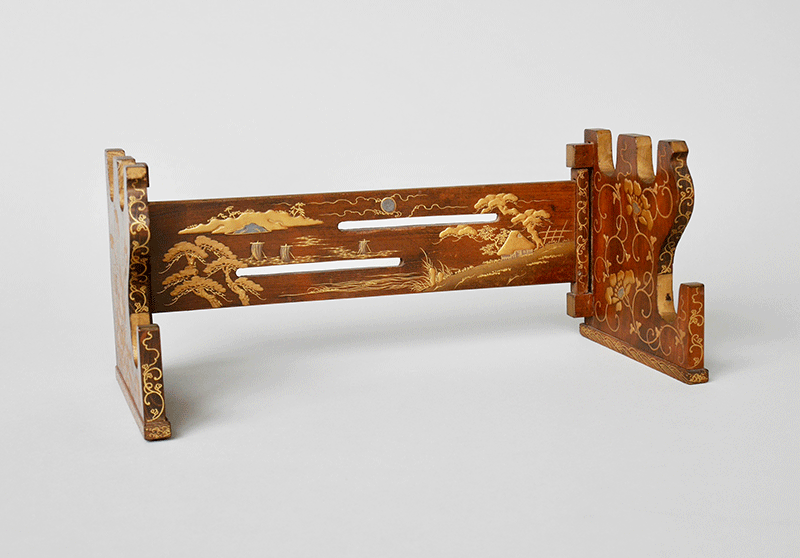左右の柱と鏡板で構成された3つの部品からなる折畳式の刀掛である。やや低めで、上部に2本、下部に1本の刀を掛けることができる。厚めの桑材に、鏡板には田舎家、松や舟などの風景と唐草が木地蒔絵で描かれ、足の外側には 秋草、内側には牡丹唐草が蒔絵されていて高級品である。
