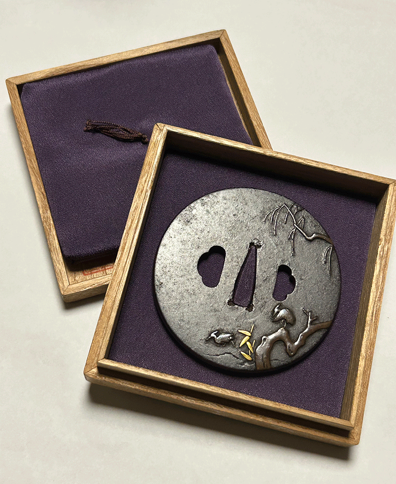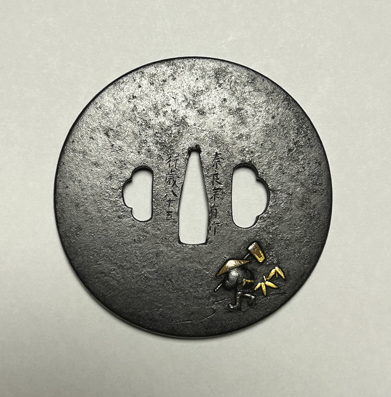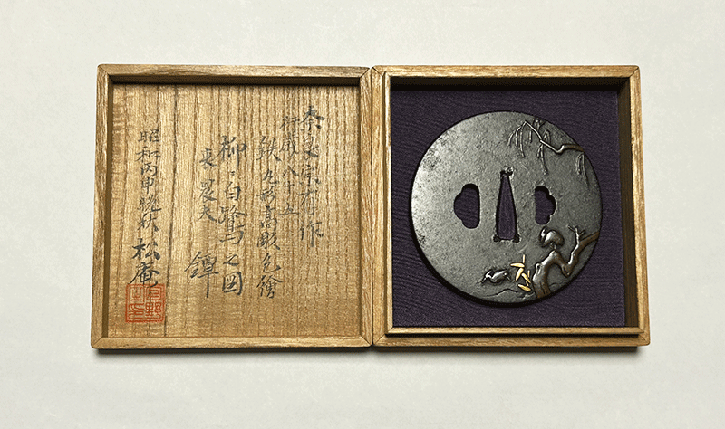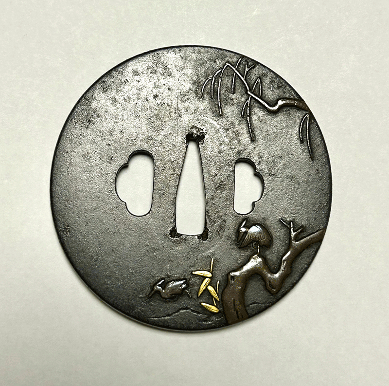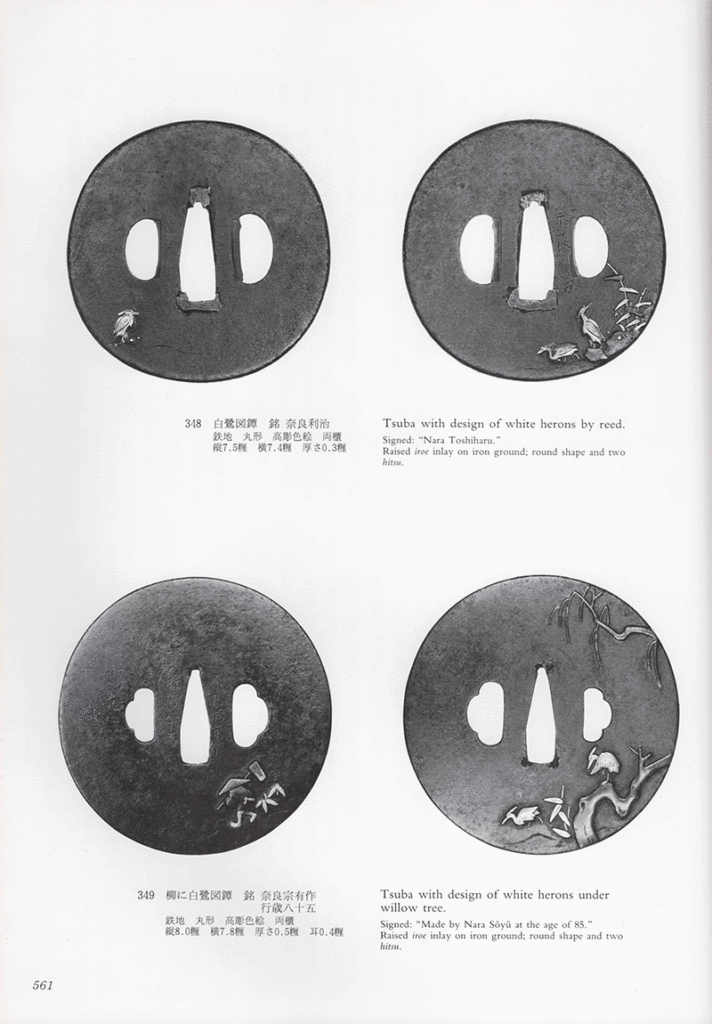 本作は鉄地に柳の樹と白鷺が高彫で描かれ、裏には鍬を担ぐ農夫が描かれている。何気ない日常の風景を如実に描き出した作品である。「奈良三作」所載品 P561