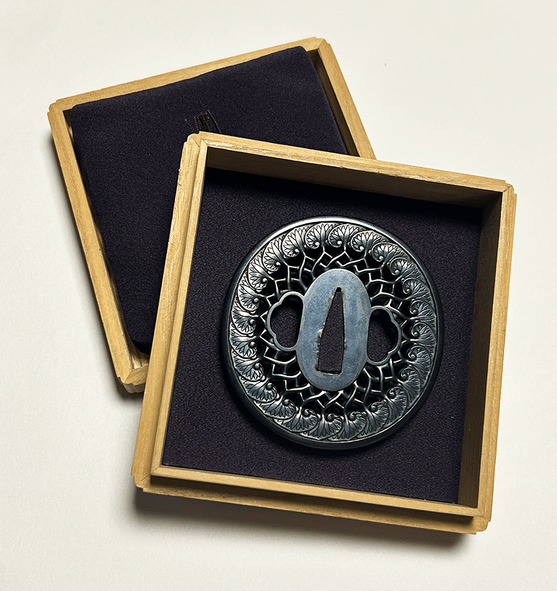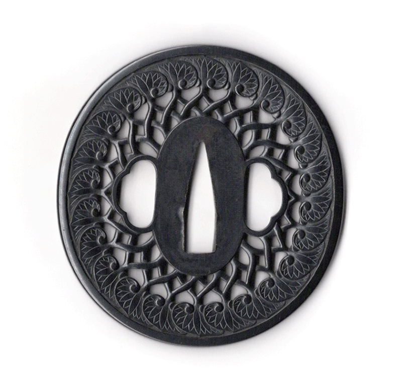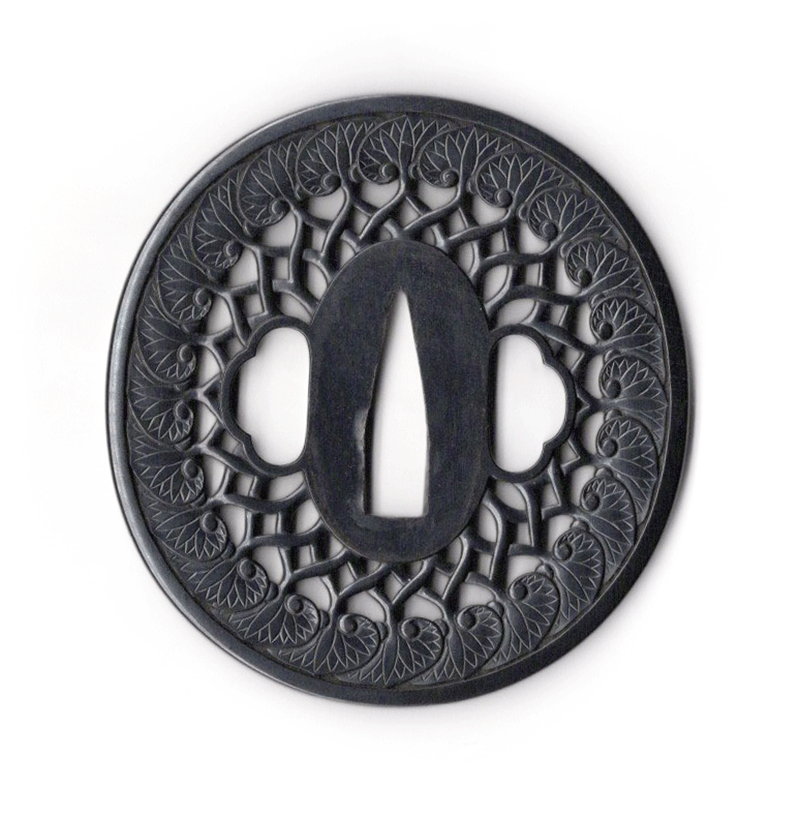 江戸幕府の鐔専門工として活躍した武州伊藤派。元禄時代の正長を初代として二代正恒、三代正方四代正吉、、九代正広十代正隆と継承している。このうち九代正広は後藤一乗門下に学んで一長と名乗った。中でも二代正恒が特に優れており、伊藤派の工法を開発、大成した良工である。本作は葵葉を規則正しく円形に配し、車輪の意匠として透かした構成は簡潔でありながらも端正な均整美を備える。一葉ごとにわずかな肉をつけ、葉脈や起伏を自然に表すことで硬質な赤銅地に温かみを与えている。