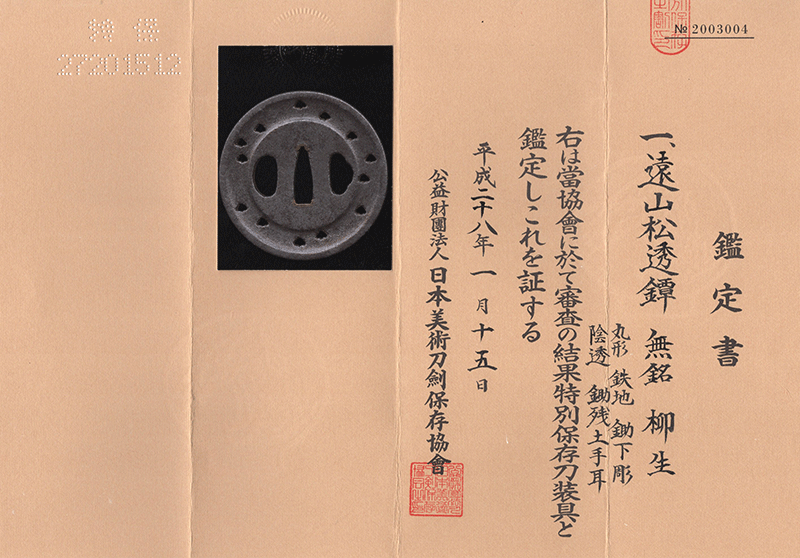 鑑定書内容:財)日本美術刀剣保存協会 特別保存刀装具[N.B.T.H.K]Tokubetsu Hozon Tousougu