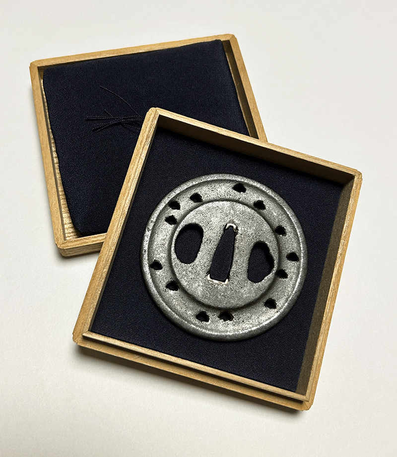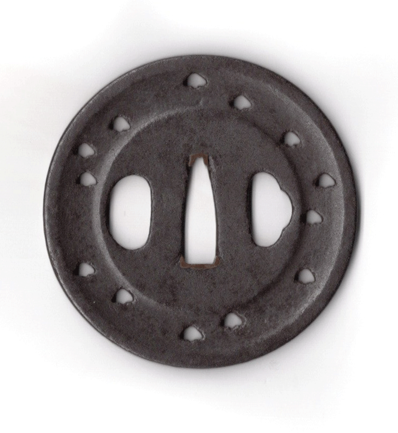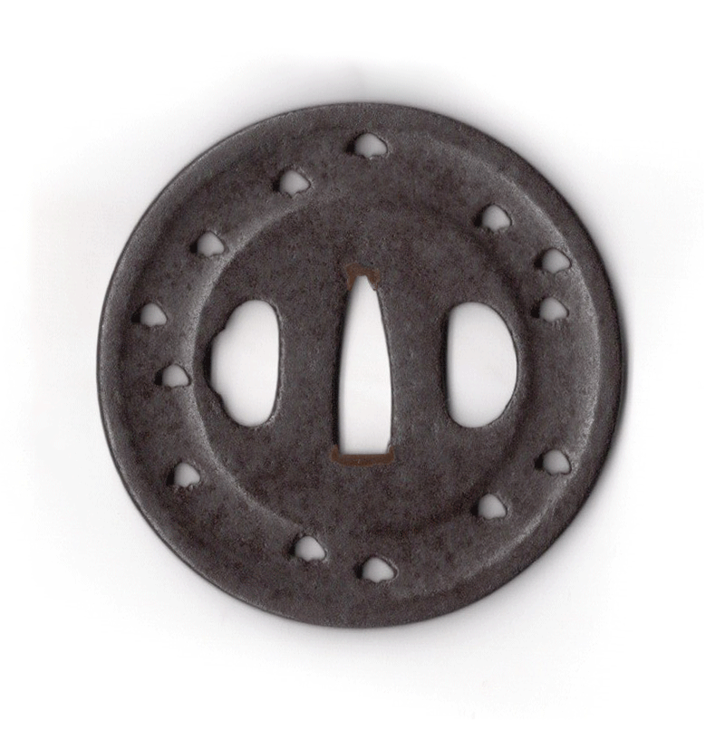 柳生は、江戸時代に活躍した金工の一派で、柳生宗矩を祖とする剣術流派「柳生新陰流」と関わりの深い刀装具を制作したことで知られる。柳生派の金工は、実戦的な刀装と精神性を重視した作風を持ち、特に「柳生鍔」と呼ばれるものは、豪華な装飾を施した後藤派や京金工とは対照的に、実戦的で簡素な美しさを持つため、武士の精神性を表すものとして高く評価されている。柳生家が徳川将軍家の剣術指南役を務めたことから、柳生鐔は武士階級の間で特に人気があったようである。本作は円相の樋に、松を透かした「遠山松」といわれる構図で、一本一本の木にとらわれずに、山を遠くから見るように俯瞰してみるという兵法の教えを表したものといわれる。鉄鐔の名著、笹野大行著、透鐔の所載品である。