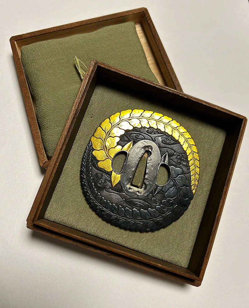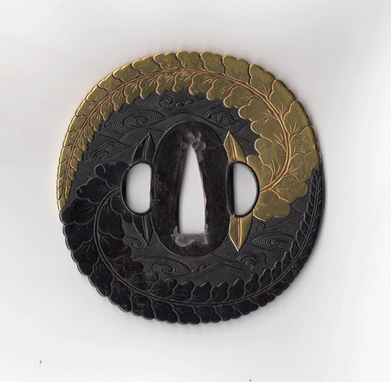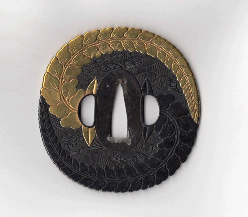 太刀の金具や鍔を製作した金工を指して太刀師、または太刀金具師と呼称している。本作は波に巴文、藤花を巧緻に組み合わせた文様となっており、上半分は金色絵を施し波の黒味を帯びた鉄地と対比させることで華やかさと立体感が更に際立つ逸品である。