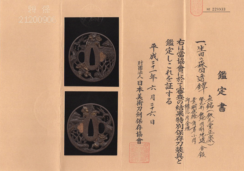 鑑定書内容:財)日本美術刀剣保存協会 特別保存刀装具[N.B.T.H.K] Tokubetu Hozon Tousoudu