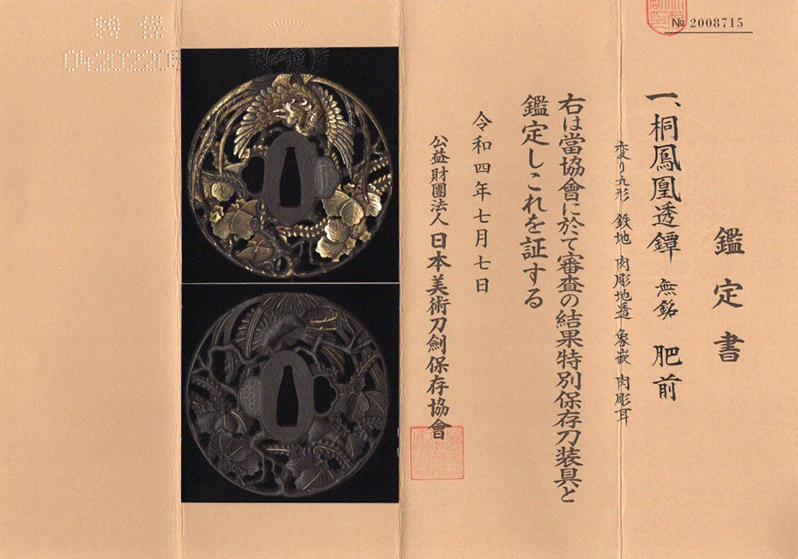 鑑定書内容:財)日本美術刀剣保存協会 特別保存刀装具[N.B.T.H.K]Tokubetsu Hozon Tousougu