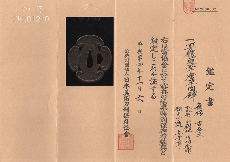 鑑定書内容:財)日本美術刀剣保存協会 特別保存刀装具[N.B.T.H.K]Tokubetsu Hozon Tousougu