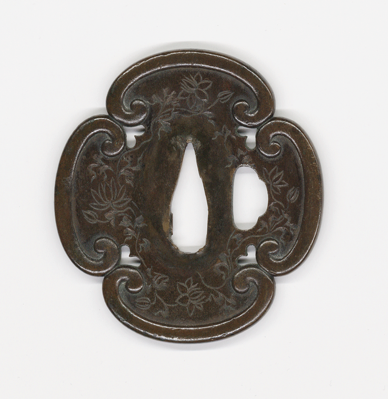 古金工とは、室町時代以前の作で銘を残さなかった金工達の総称である。多くは山から掘削したままの山銅を用いてざっくりと削り出した野趣に溢れる作品群であるが、極一部に良く精錬された銅や四分一地に高度な彫金、色絵の技を用いて制作され、他を圧倒する技術力を示した入念作も存在する。本作は木瓜形の山銅地に猪目が小透かしで入っており、前面に蓮華模様が緻密に広がっている華やかな逸品である。