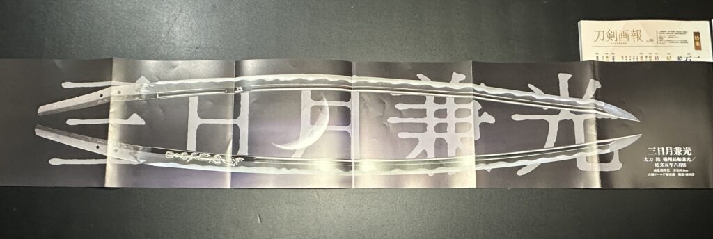 折込付録の実物大刀剣ポスターは最近ニューヨークのオークションで落札され、日本に里帰りした上杉家35腰の一つ、三日月兼光(みかづきかねみつ)刀剣ワールド財団所蔵と雲重(うんじゅう)新見美術館所蔵