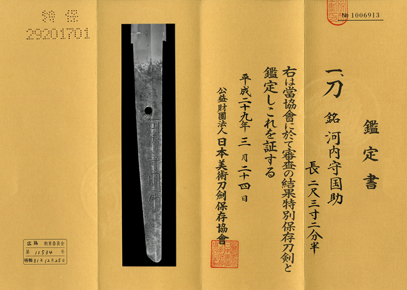 2代河内守国助は初代国助の嫡子で、俗に「中河内」と呼ばれている。彼は小板目肌のよくつんだ鍛えに華やかな丁子乱れの作風を得意とし、世に「拳形丁子」と称せられる独特の握り拳形の丁子刃を創始して名高い。