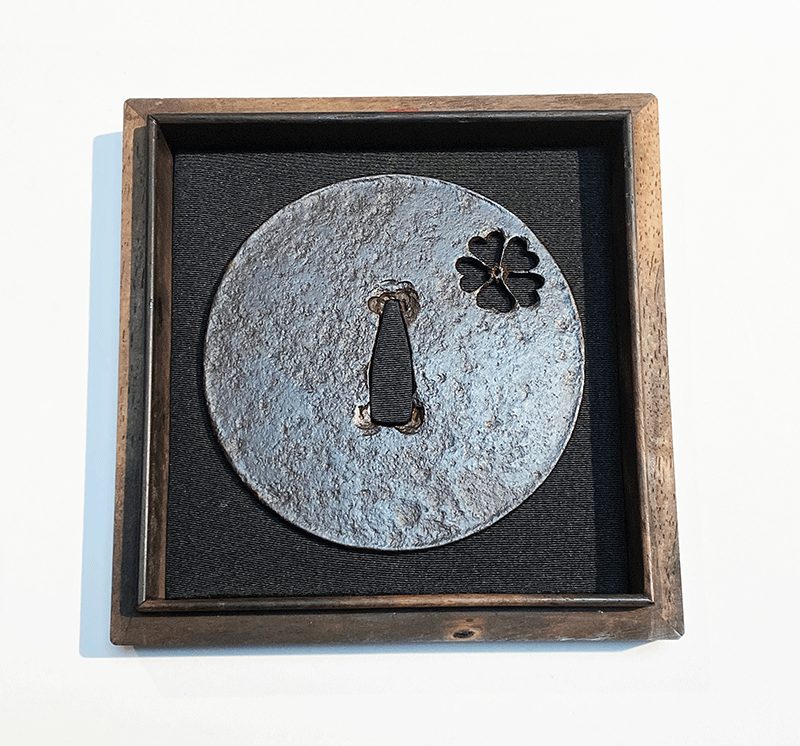打刀に添えられる鐔は、刀匠が鍛えた刀に自らの作鐔を添えていたことに始まると言われ、その後、帯刀者が単に実用品としてのみの鐔から実用と同時に鑑賞品の鐔として取り扱うようになって、甲冑師や鏡師などが余儀に制作するようになり、殊更に雅趣ある鐔が出現した。甲冑師鐔とは、よく鍛えられた鉄地を用いて耳際を厚く作り込み、無象嵌の薄い板鐔に透彫を施したものをいう。中でもその制作が室町時代以前にさかのぼるとみられる古い作品群を「古甲冑師」と極めている。本作は鍛の良い薄手の地に桜花をただ一輪透かすのみという前掲の古刀匠鐔と全く同手の意匠に見えるが、仔細に見ると僅かに耳を打ち返している(耳重ね3.2mm)事から古甲冑師と極められている。耳の造り込み以外は完璧に古刀匠鐔の意匠であり、古刀匠鐔と古甲冑師鐔の移行期を思わせる。また造形自体もわずかに打ち返した耳のおかげで格調高く纏まっており、優れた造形を示した名鐔である。