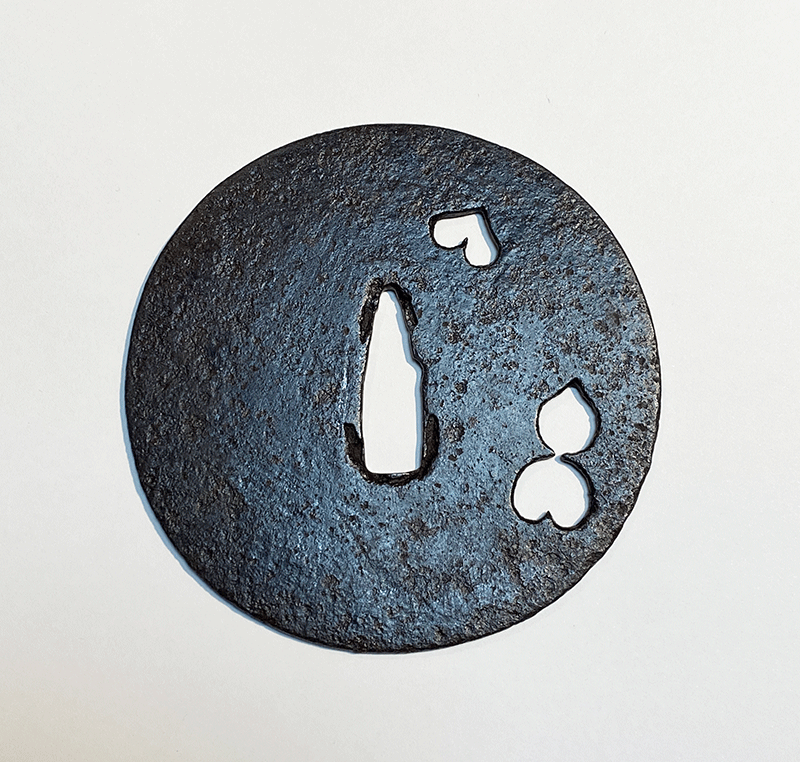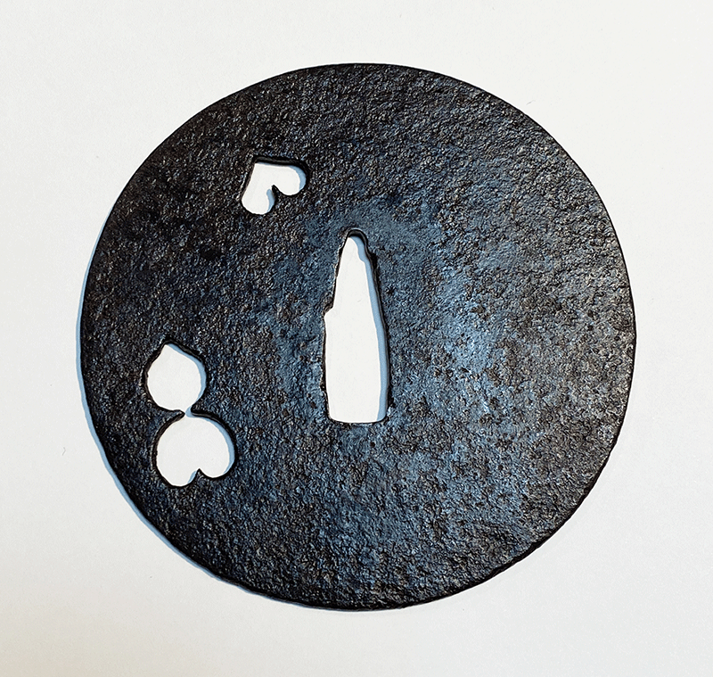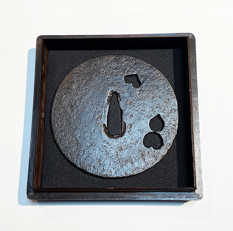 この鐔は上記の作風を顕示し、かつ無櫃(小柄、笄の穴が無いこと。多くの物は後で櫃穴が加えられている。)で伝世した状態の良い優品である。縦横の寸尺は92.7mmのほぼ真円で、重ねは2.4mm。古刀匠鐔の中でも特に大きく迫力のある作品となっている。