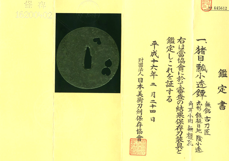 鑑定書内容:財)日本美術刀剣保存協会 保存刀装具[N.B.T.H.K] Hozon Tousougu