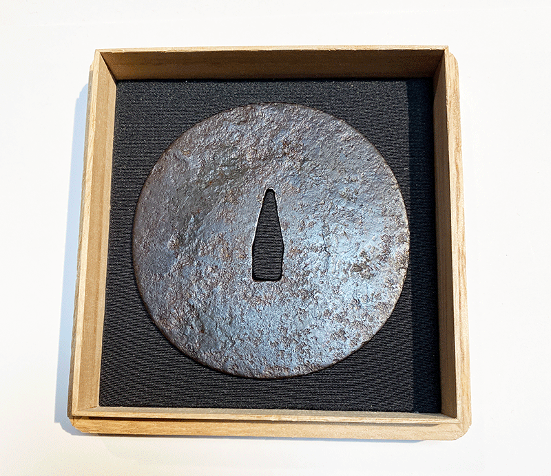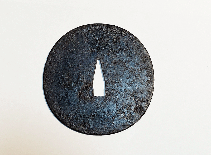 掲出の鐔は上記の作風を顕示し、かつ無櫃(小柄、笄の穴が無いこと。多くの物は後で櫃穴が加えられている。)無紋、一切の装飾を廃し、究極の実用性の中に美を見出した作品であり、古刀匠鐔の中でもこの手の作品は極めて稀で、刀装具の起源であり、終着点ともいえる。