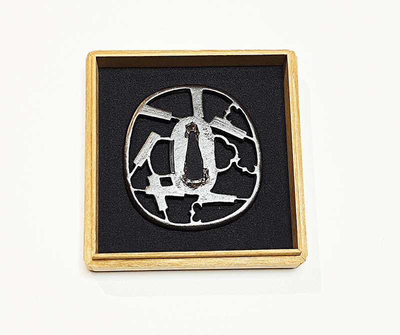 本作は七つの扇を即興的に平地に透かし、雁を三羽添えている。鉄には潤いがあり、耳には緩やかな線状や粒状の鉄骨が浮かび、穏やかな初代勘四郎の特徴をよく示した優品である。伊藤満著 「西垣works of Kenshiro Nishigaki」 に所載の品で、著者の箱書が添えられている。