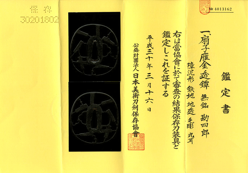 鑑定書内容:財)日本美術刀剣保存協会 保存刀装具[N.B.T.H.K]Hozon Tousougu
