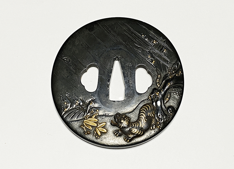 赤銅磨地に高彫で強風にたなびく竹林で身構える虎を金、銀、四分一、素銅などの各種色絵を用いて写実的に描き出している。平成30年の尚友会出品作であり、後に出版された橋本晴夫氏著「刀装具の鑑賞Ⅱ」にて紹介された同作中の傑作である。