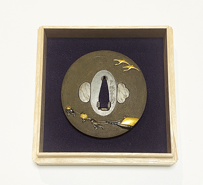 戸張派の富久は後藤宗家13代光孝門下の実力者で、はじめ師の下彫に従事していたが、後に後藤家をはなれて独立開業し、生まれ故郷の雑司ヶ谷にて腕をふるったという。その作風は師風の後藤流を継いだ実直な物であり、赤銅魚子地に高彫の格調高い優品を多く残している。本作は四分一地の魚子地に高彫、象嵌色絵で舟を曳き荷物を運搬する人々を描き、裏の下半には金の削継色絵の図面に毛彫で草花を描いている。削継で金の図面を構成する手法は師、光孝が用いた画期的な手法であるが、師の作に比べてやや角度をなだらかに継ぐことで図面にやや柔らかみがあたえれている。また通常後藤家で用いられることのない四分一を用いたのは、師風に習いつつも新たな境地を生み出そうとする同作の意欲の表れと見ることができ、後藤風の謹厳実直な作域から脱却し、新たな境地の発芽を感じさせる同作中の名鐔である。