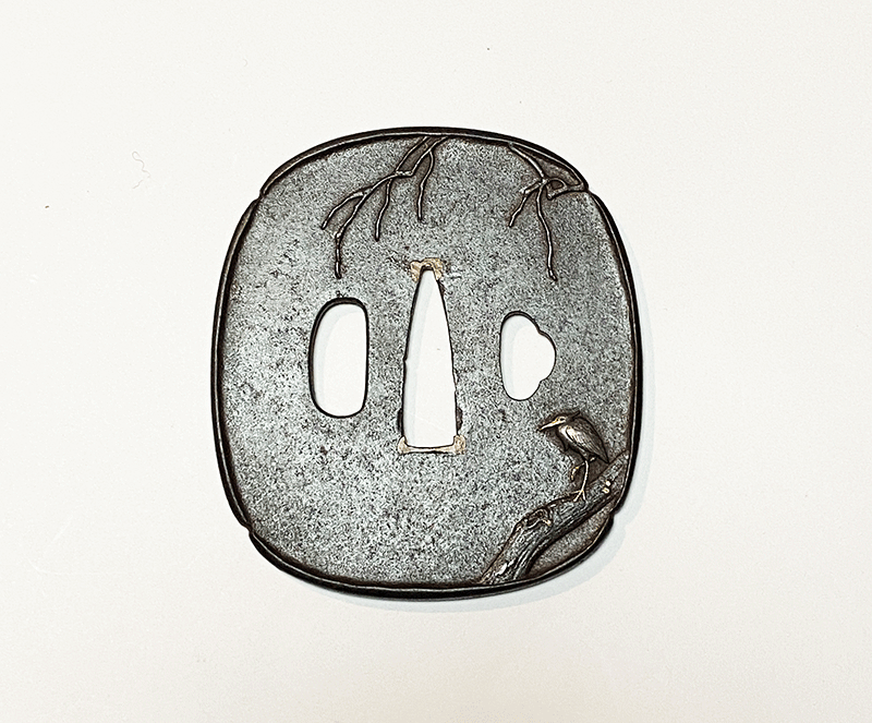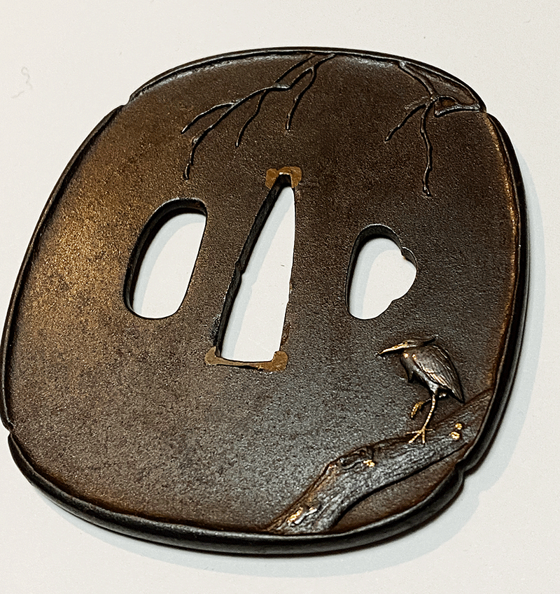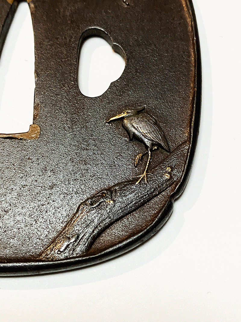 本作は若作といわれる秀信銘の作品であるが、後藤家では本来用いない鉄を素材に制作していることから既に一乗に師事した作と見られる。余白を多くとった図面の右下に力強い幹と、その上の片足で立つ白鷺は写実的で実に格調高く、東明が若くして既に一級の技量を磨き上げていた事を示す優品である。