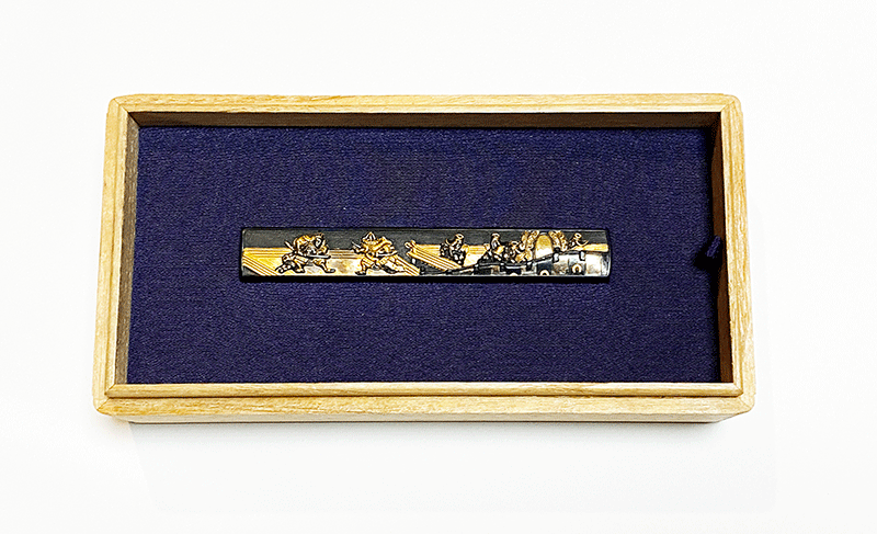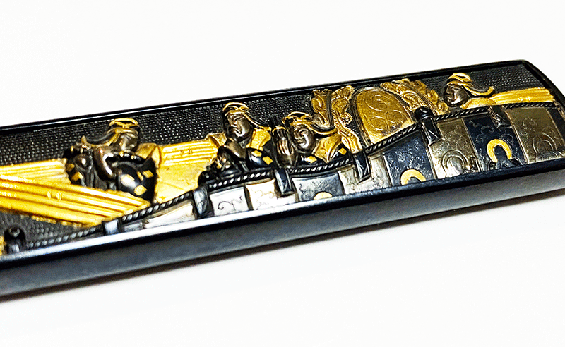 本作は悦乗在銘の小柄で、額いっぱいに彫り出された舞台上で舞い、演奏する舞楽の演者達の姿を色とりどりの色絵を用いて華やかに描き出した優品である。平成30年尚友会出品の作で古い包みと台紙が付帯している。