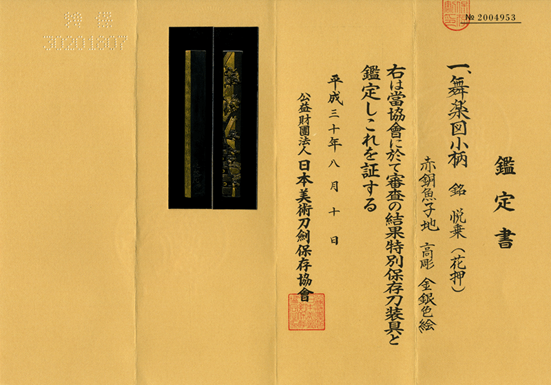 鑑定書内容:財)日本美術刀剣保存協会 特別保存刀装具[N.B.T.H.K]Tokubetsu Hozon Tousougu
